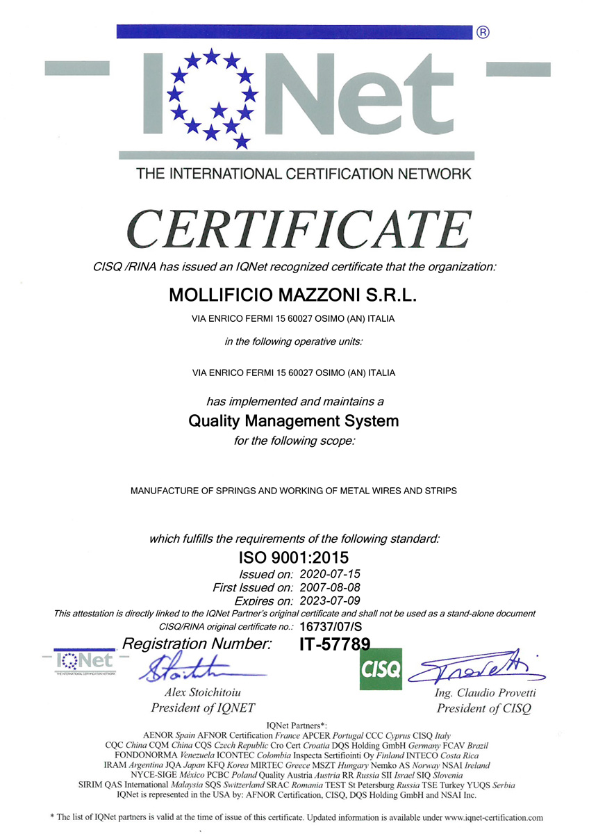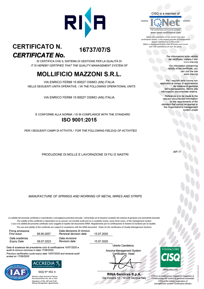 Il Mollificio Mazzoni dispone di un Sistema di gestione aziendale certificato in conformità alla norma ISO 9001 (dal 1998), ISO TS 16949 (dal 2005), IATF 16949 (dal 2017).